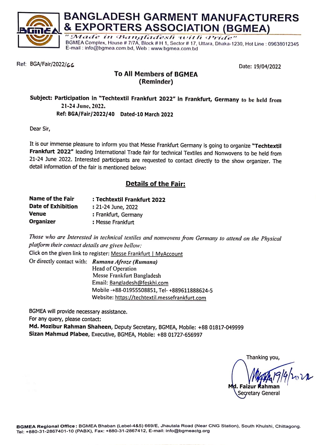 Title: | Subject: Participation in “Techtextil Frankfurt 2022” in Frankfurt, Germany to be held from 21-24 June, 2022. Ref: BGA/Fair/2022/40 Dated-10 March 2022 |