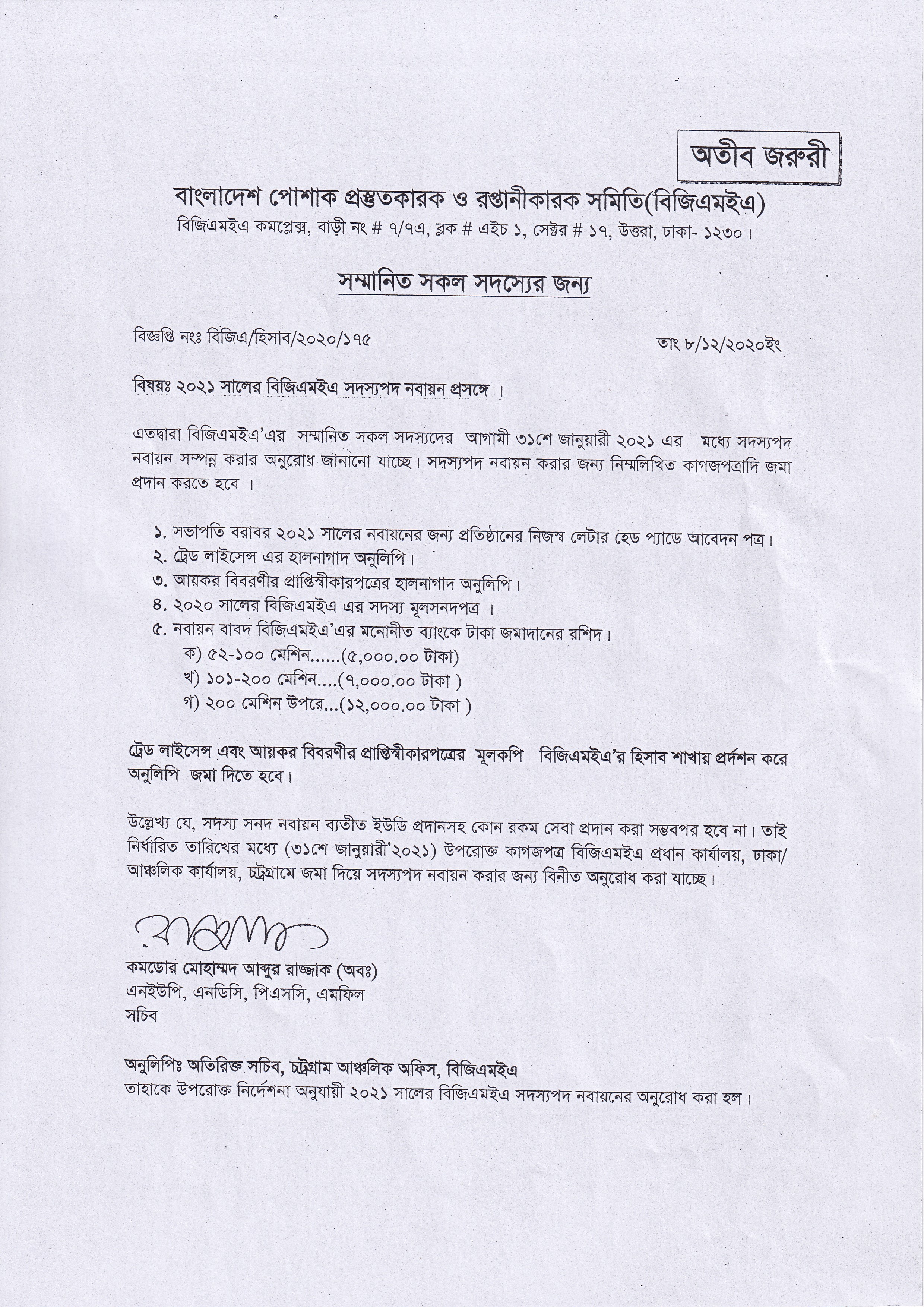 BGMEA Circular regarding Membership Renewal