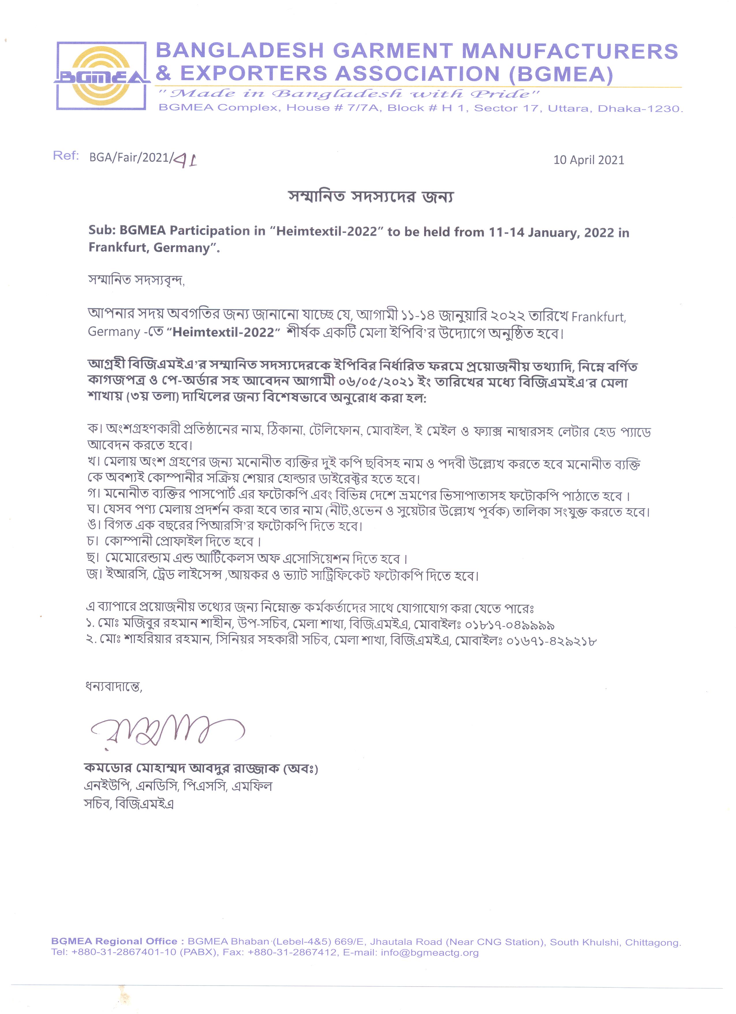 Title: | BGMEA Participation in “Heimtextil-2022”to be held from 11-14 January, 2022 in Frankfurt, Germany”. |