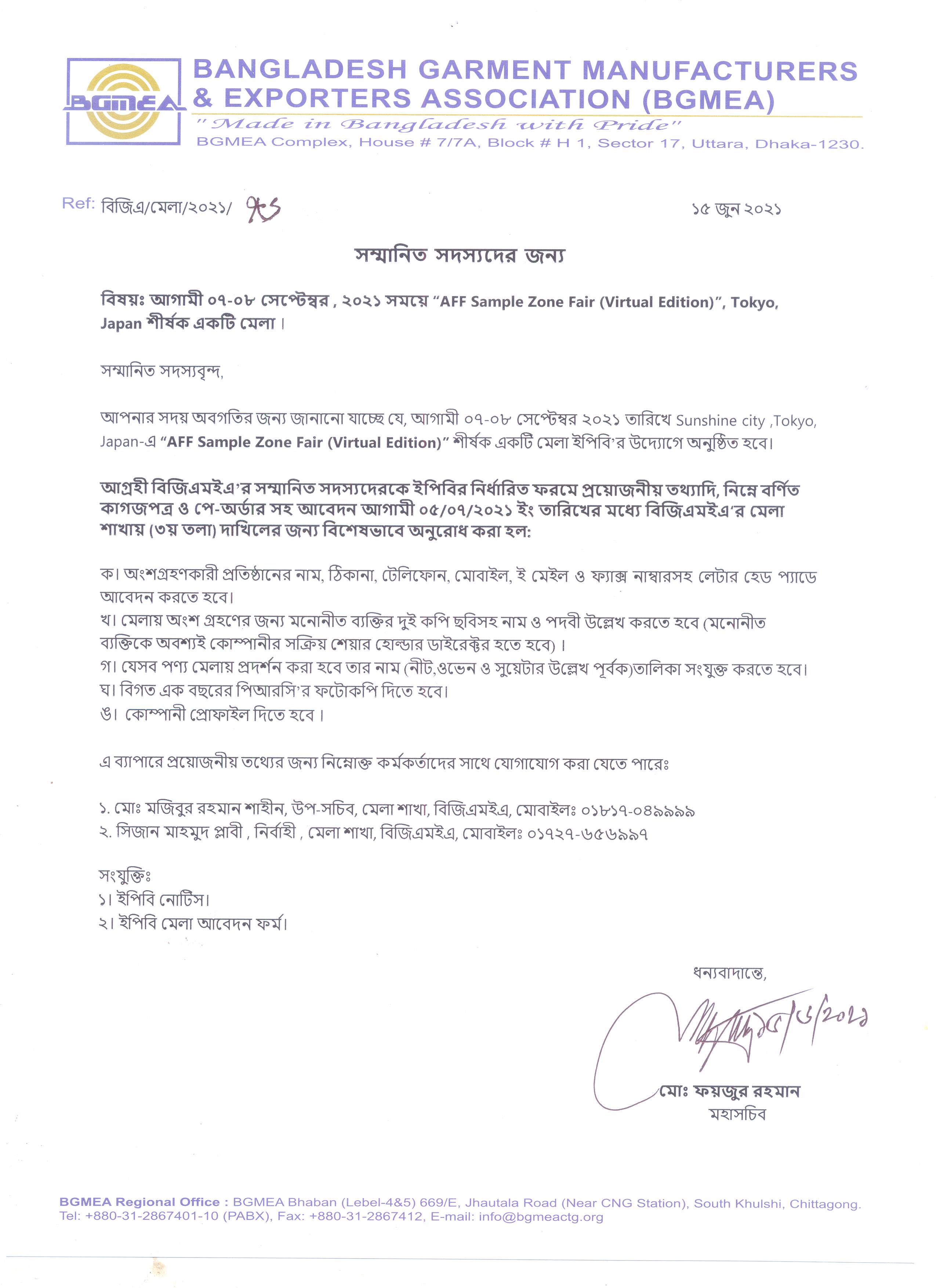 Title: | আগামী ০৭-০৮ সেপ্টেম্বর , ২০২১ সময়ে “AFF Sample Zone Fair (Virtual Edition)”, Tokyo,Japan শীর্ষক একটি মেলা । |