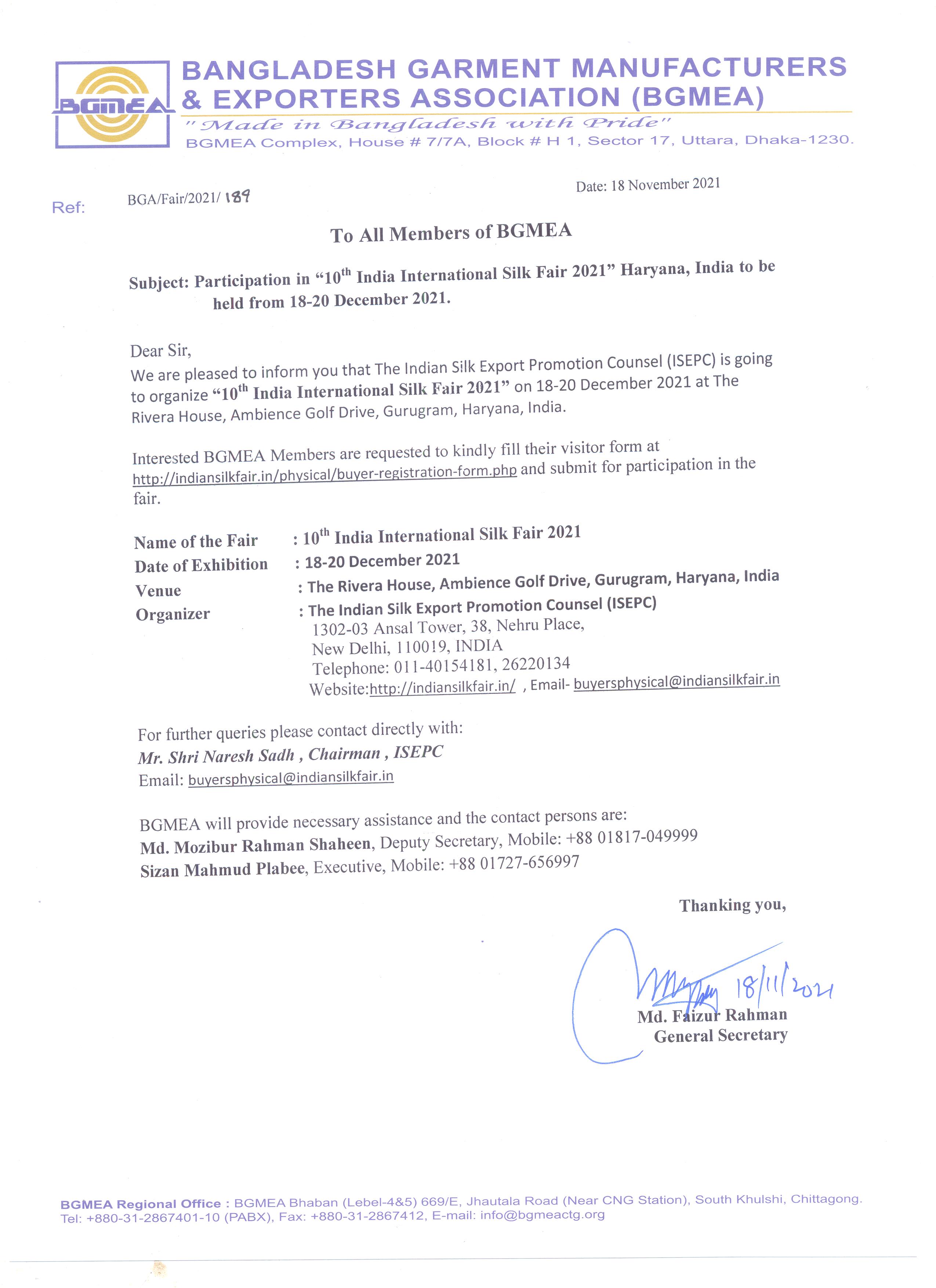 Title: | Participation in “10th India International Silk Fair 2021” Haryana, India to be held from 18-20 December 2021. |