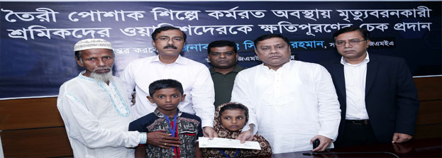 BGMEA First Vice President Moinuddin Ahmed handed over the cheques of group insurance to the...