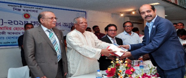 Md. Atiqul Islam, BGMEA President, receives the CIP card from Mr. Amir Hossain Amu, Honorable...