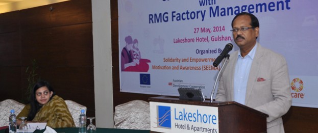 BGMEA Vice President Md. Shahidullah Azim speaking as chief guest at a consultation workshop with...
